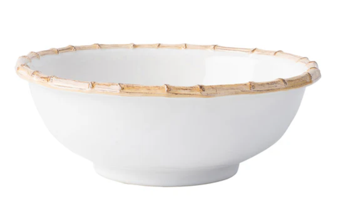 From our Bamboo Collection - A modern serving bowl encircled with a traditional bamboo rim. This piece is a chic addition to any decor