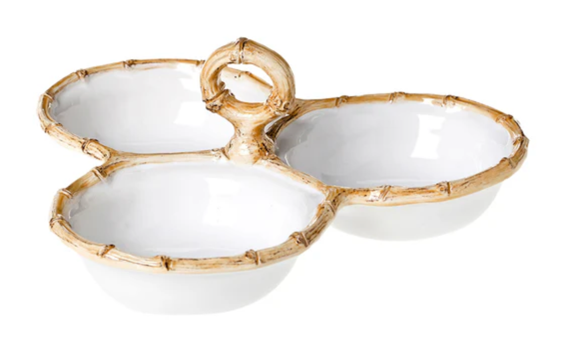From our Bamboo Collection- Add a splash of bohemian beauty to cocktail hour. Our bamboo-rimmed trio of ceramic serving bowls are united by a ring-shaped handle that makes transporting nibbles a breeze - from cocktail mixes on the veranda to homemade spiced nuts
