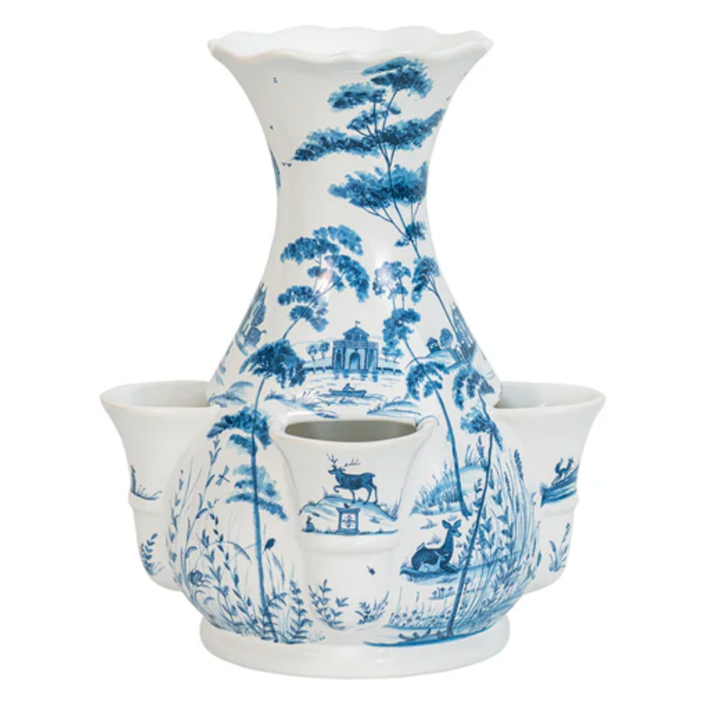 From our Country Estate Collection - Hopeless romantics, we have married our beautiful Delft blue vase with our stunning 17th-century-inspired Tulipiere to create this fabulous vessel that truly showcases flowers to their very best. The central vase is ideal for bunches and bouquets, while the individual receptacles at the base of the Tulipiere are for spotlighting single stems. The result is a blossoming sculpture - depicting idyllic scenes of the flora and fauna of our beloved Country Estate - and is fit to grace any dining table, entryway, or mantle with a gorgeous bounty of blooms.