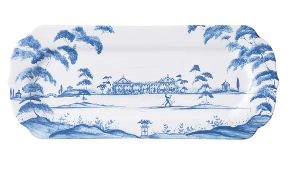 From our Country Estate Collection- "If music be the food of love, play on..." Our lovely tray illustrates the perfect ingredients for a bit of romance: fondness of dancing, a little moonlight, and a fabulous garden party. Lavish it with our Amalia Champagne flutes filled to the brim with golden bubbly and pass it along. Featuring: Garden Party, Rose Arbor, and Hen House.