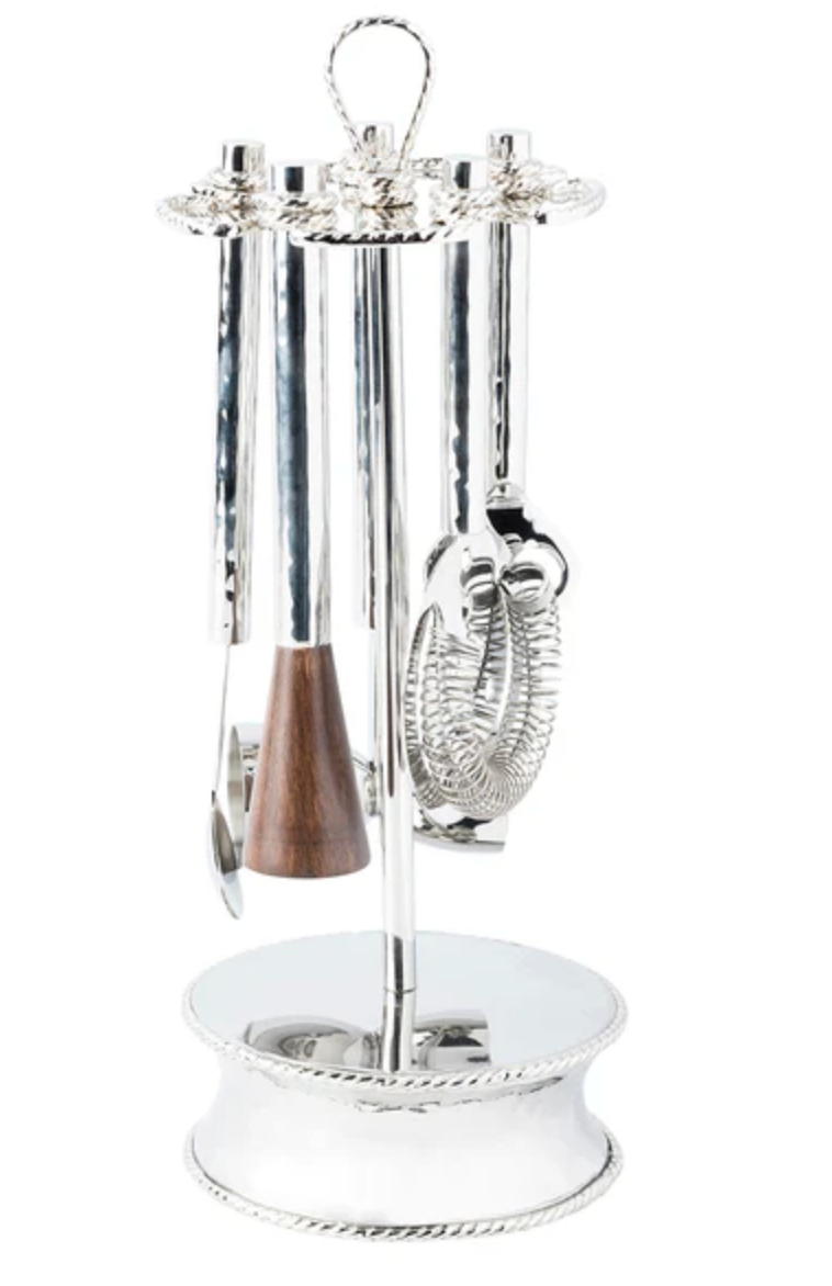 Hammered stainless steel bedecked with a tidy trimming of simple thread, this bar tool set is as handsome as it is supremely useful when crafting a cocktail, such as our favorite Monaco Mule! Set includes stand and five tools: double-sided jigger, cocktail strainer, bar spoon, bottle opener and muddler