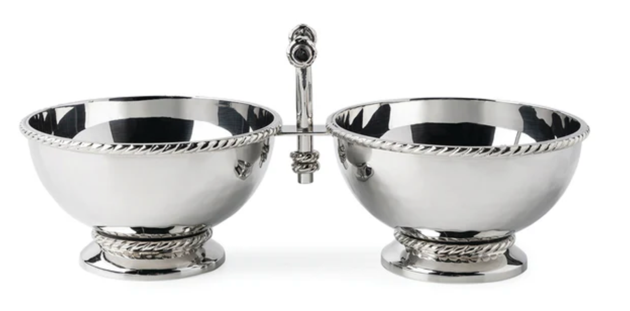 Decorated with a tidy trimming of simple thread, each piece in our Graham barware collection is handmade in hammered stainless steel and polished to brilliance. This two section server features double cocktail-sized bowls and a sturdy handle for transporting your favorite nibbles