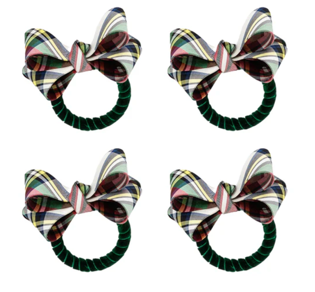 These tuxedo-inspired napkin rings, trimmed in our signature Stewart Tartan, will make a festive statement at every placesetting. Handsewn with rings wrapped in soft velvet ribbon, these dapper bows will festoon any table with festively elegant flair
